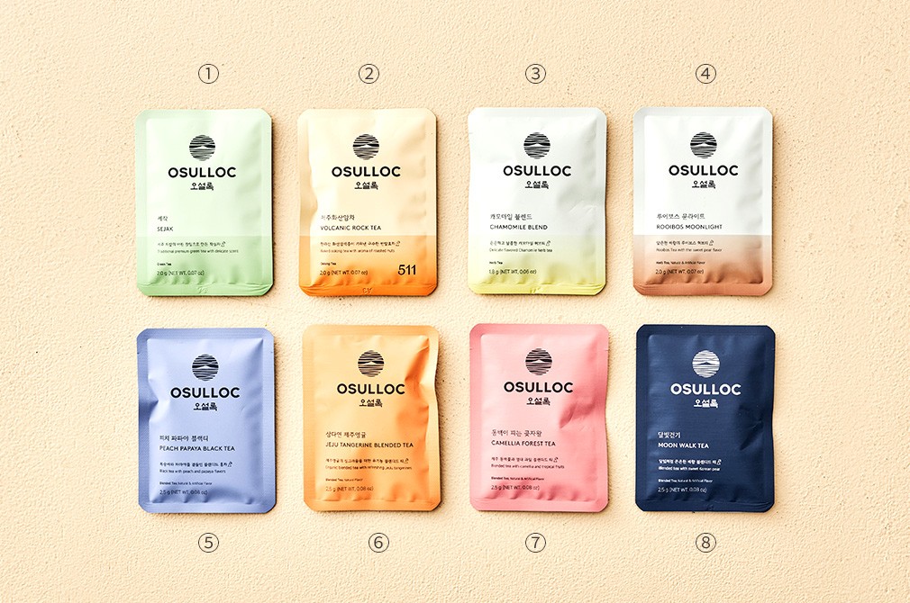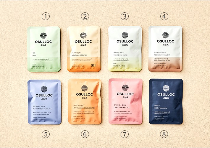 오설록 마스터 블렌드 티 세트・구성:①세작,②제주 화산암 차,③캐모마일 블렌드,④루이보스 문라이트,⑤피치 파파야 블랙티,⑥삼다연 제주 영귤,⑦동백이 피는 곶자왈,⑧달빛걷기