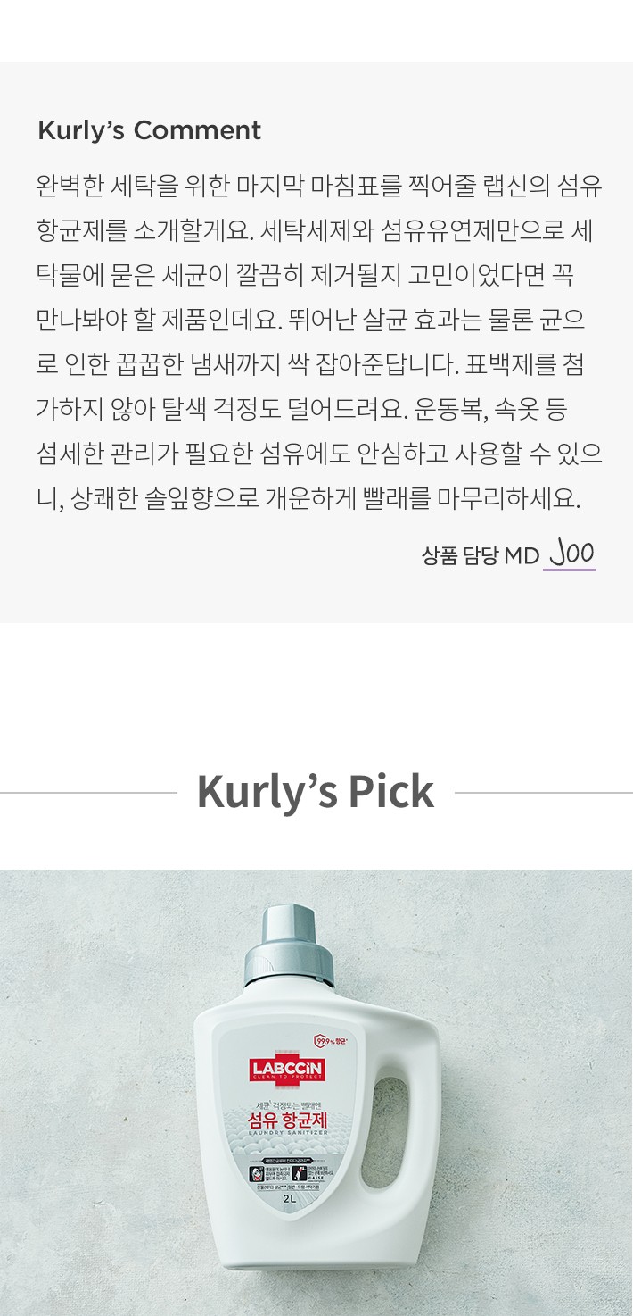 ・특징:세탁물에 묻은 세균을 제거해 더욱 깔끔한 빨래가 가능한 섬유 항균제입니다. 상쾌한 솔잎향이 은은하게 나요.