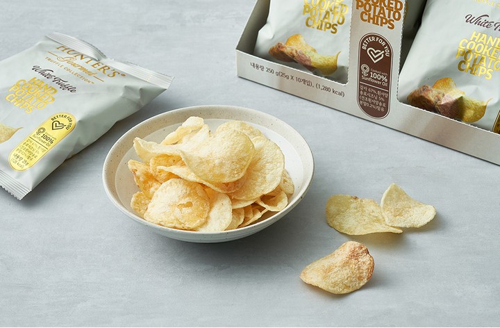 30년 전통의 아랍 스낵 회사,헌터즈는 매혹적인 향의 트러플로 프리미엄 감자칩을 만듭니다. 지금 소개하는 제품은 블랙 트러플의 진한 향이 다소 부담스러운 분들께 안성맞춤인 화이트 트러플 감자칩이에요. 부드러운 트러플 향에 고소한 풍미로 더욱 가볍게 즐기기 좋지요. 오직 감자와 해바라기유,화이트 트러플 시즈닝만으로 깔끔하게 완성했으니 안심하고 드실 수 있답니다. 소포장 된 제품 10봉을 박스에 넉넉히 담았으니,짭조름한 감자칩이 생각나는 순간 언제든지 즐겨 보세요.