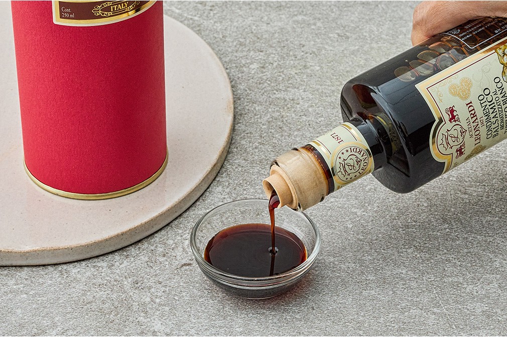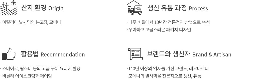 좋은 발사믹의 기준 좋은 발사믹이란 어떤 걸까요? 우선은 숙성 기간을 따져볼 수 있어요. 발사믹은 숙성 기간이 길수록 향기와 풍미가 좋아지며 점성이 생깁니다. 숙성 방법 역시 중요한 요소입니다. 발사믹의 숙성 과정을 ‘디켄딩’이라고 하는데요,이 디켄딩 과정에서 체리,오크,밤나무,물푸레,목향 나무 등 다양한 배럴에 옮겨 담아 가며 각기 다른 고유의 향이 잘 섞이도록 합니다. 기온이 낮은 겨울이 되면 큰 통에서 작은 통으로 옮겨주기도 하지요. 이런 길고 까다로운 과정을 거쳐야 비로소 한 방울만으로도 매혹적인 향을 뿜어내는 발사믹이 완성된답니다.