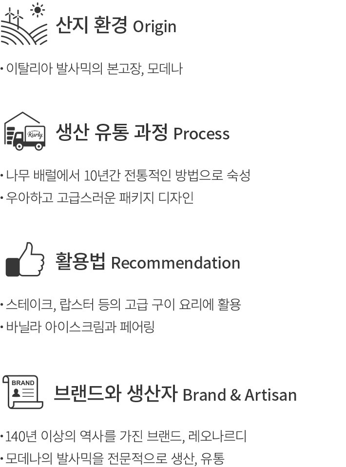 레오나르디 가문은 140년간 전통적인 숙성 기법으로 발사믹 비니거를 생산해오고 있습니다. 1871년에 설립된 이래로,4대에 걸쳐 이탈리아를 대표하는 전통 발사믹을 만든다는 자부심을 가지고 제품을 생산하고 있지요. 레오나르디 모데나 발사믹은 원래 상류층들만 즐기던 고급 식초로,‘공작의 식초’라 불리기도 할 만큼 뛰어난 품질과 차별화된 맛을 자랑합니다. 현재 미국의 고급 식료품/주방기구 판매 회사로 유명한 윌리엄 소노마의 프라이빗 라벨 발사믹을 만들어줄 정도로 그 기술력과 품질을 인정받고 있습니다.