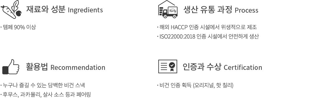 ?특징:바베큐향 시즈닝으로 감칠맛을 더한 템페 칩스예요. 발효 콩 특유의 향미가 부담스러우신 분들께 추천드려요.