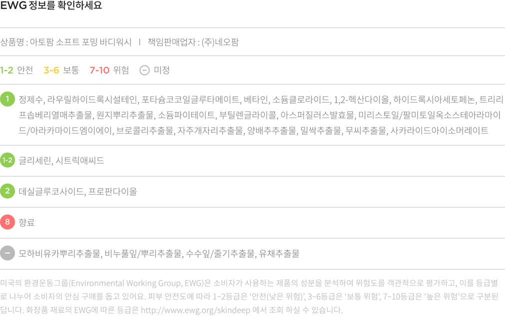 사용법・ 샤워타월 혹은 손에 적당량을 덜어 충분히 거품을 내주세요. 몸 전체에 부드럽게 마사지한 후 미온수로 깨끗이 헹궈냅니다.