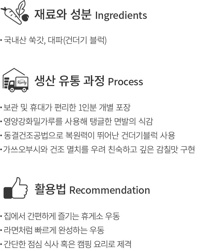 ・특징:대파,쑥갓 등을 동결 건조한 건더기 블럭과 고소한 어묵을 토핑으로 담은 우동입니다.