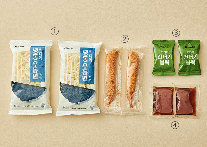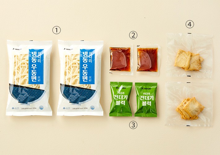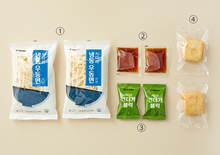 01. 어묵 우동・구성:①우동면,②우동소스,③건더기블럭,④어묵