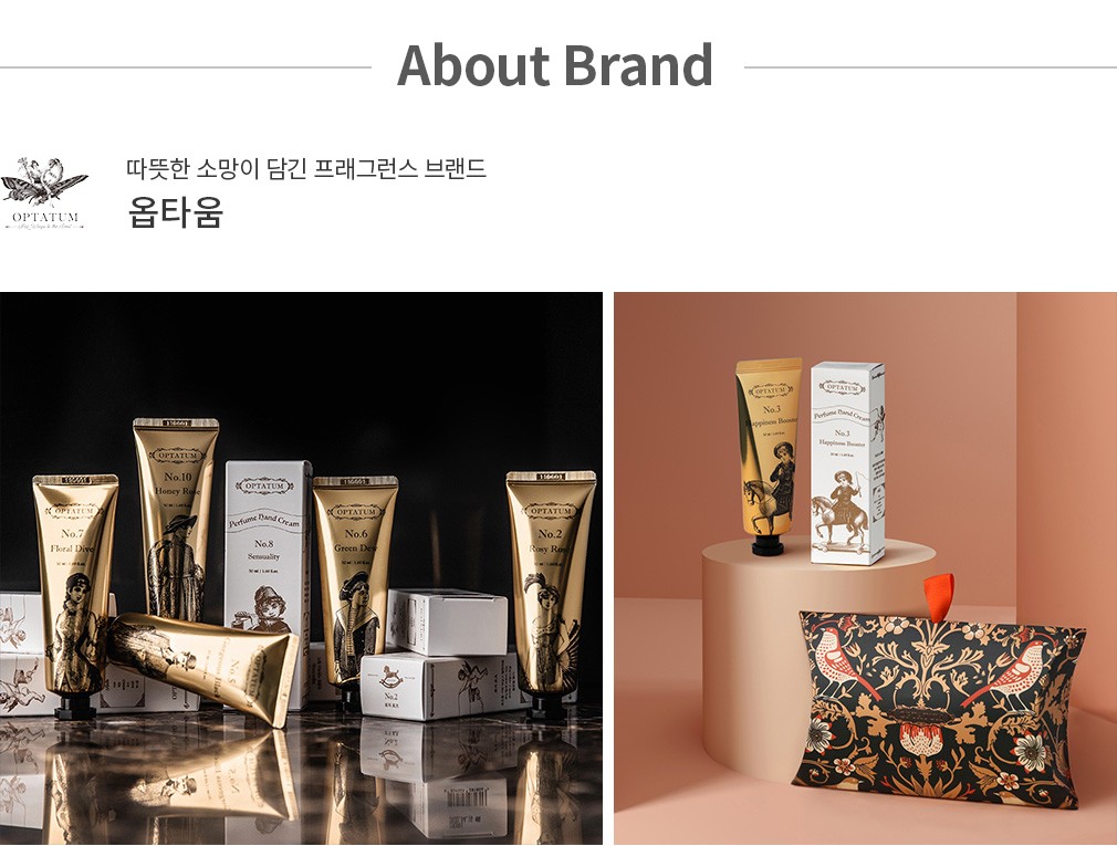 옵타움(OPTATUM)은 라틴어로 '소망'이라는 뜻이에요. 옵타움은 모든 사람들에게 향기로운 일상을 선물하고 싶다는 소망을 담아 탄생한 프래그런스 브랜드이죠. 섬세하게 블렌딩하여 완성한 다양한 향을 선보이고 있는데요. '나의 향기 찾기' 서비스를 통해 각자의 성향에 맞는 향기를 찾을 수 있도록 돕기도 해요. 19세기 영국에서 영감을 받은 럭셔리 빈티지 컨셉의 디자인도 돋보이죠. 옵타움의 감각적인 향과 함께 일상에 특별함을 더해보세요.