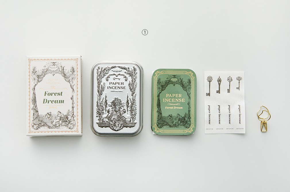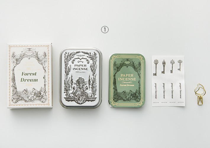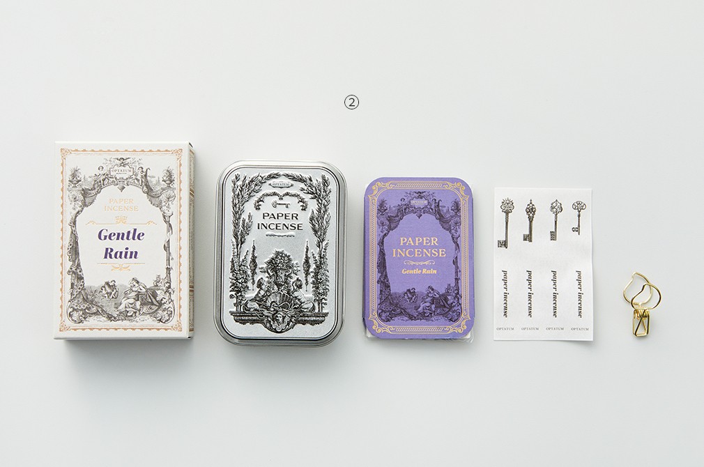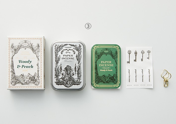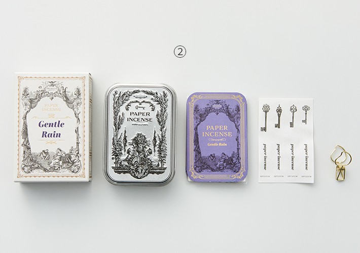 ・구성 :①틴케이스,②페이퍼 인센스 12장(48회분),③물방울 집게