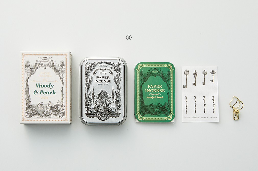 ・구성:①틴케이스,②페이퍼 인센스 12장(48회분),③물방울 집게