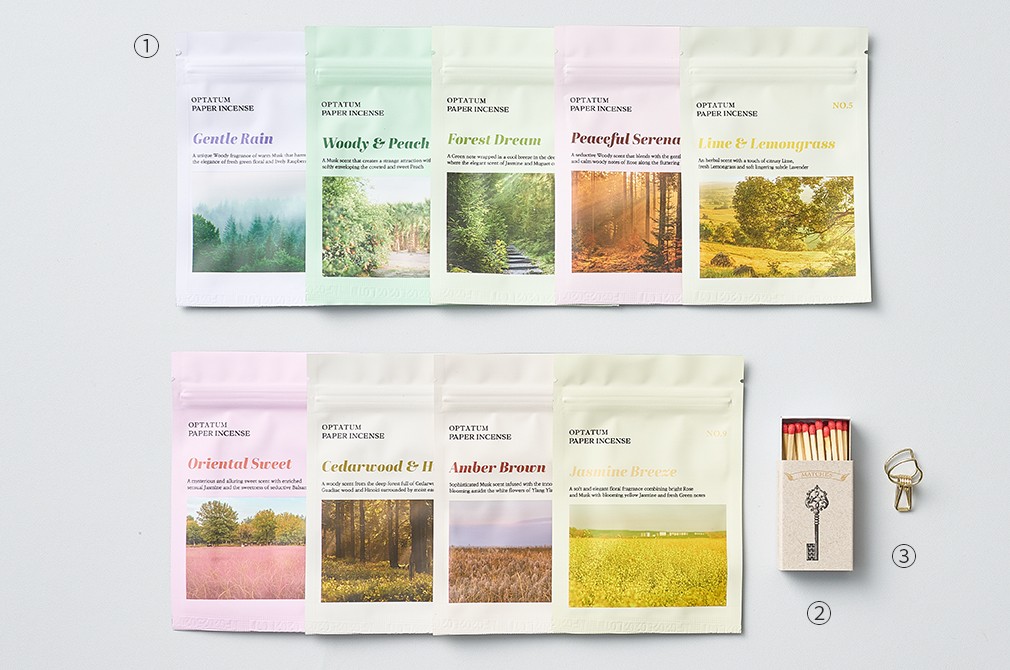 - 구성:①페이퍼 인센스,②빈티지 성냥,③골드 집게