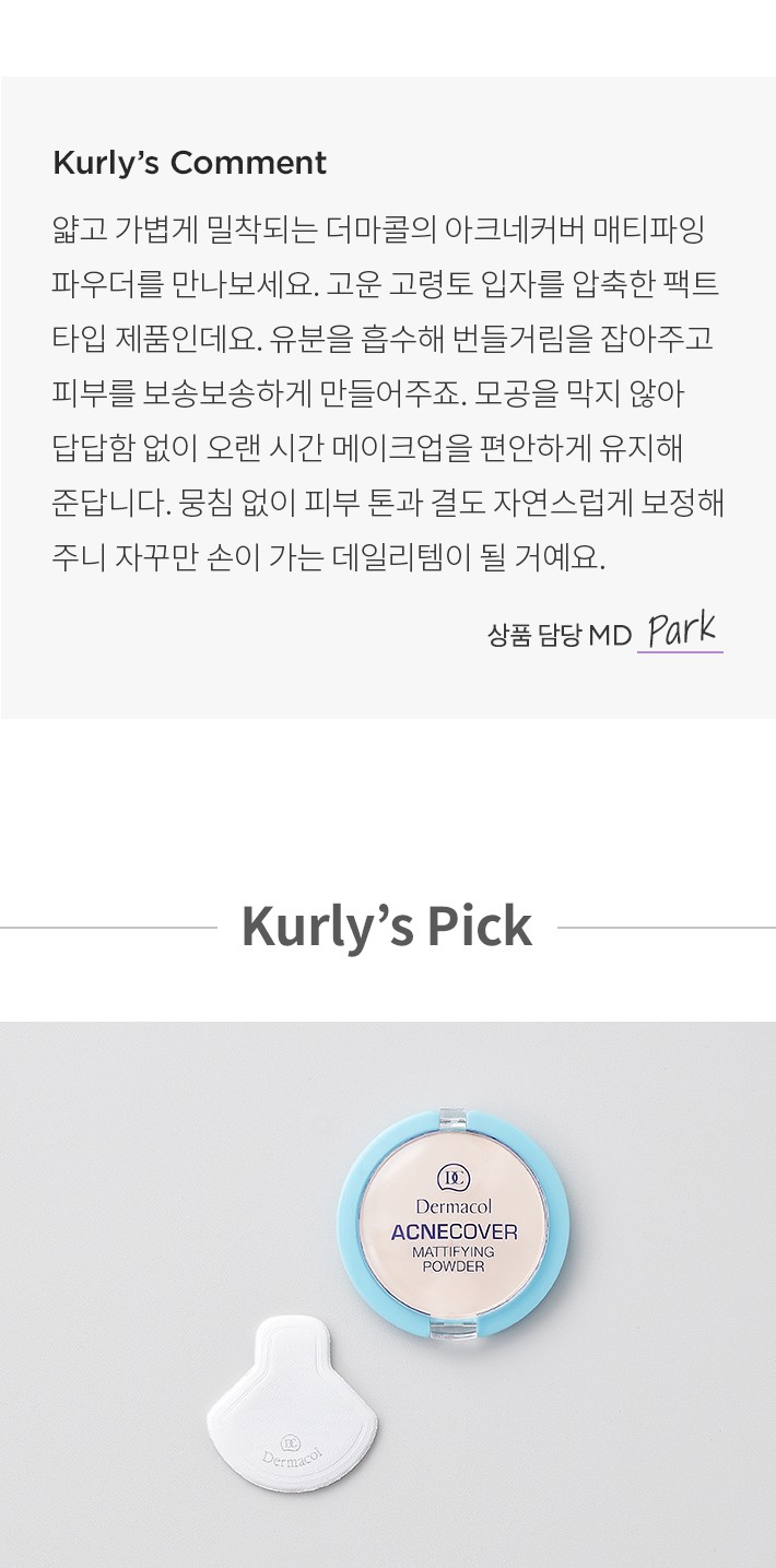 추천 루틴・ 파우더 사용 전 더마콜의 메이크업 커버 크림 파운데이션을 발라보세요. 더욱 높은 커버력을 경험할 수 있습니다.