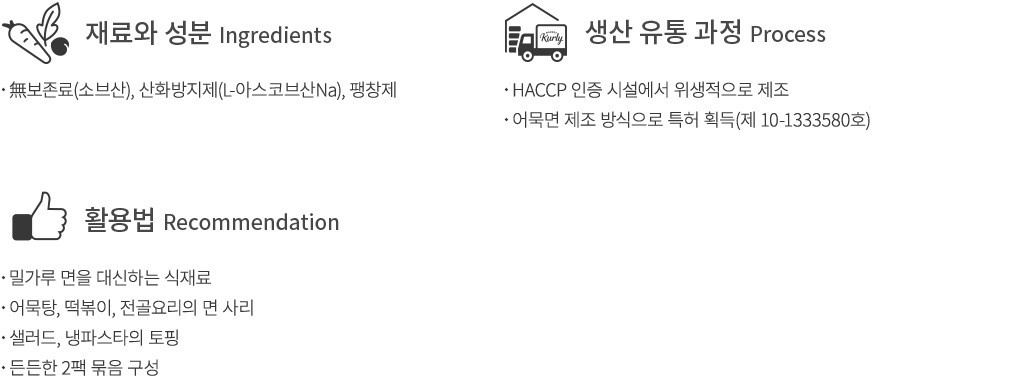 조리 전 참고사항?진공팩에서 어묵면을 꺼내면 다소 뭉쳐 보일 수 있어요. 끓는 물에 들어가면 저절로 잘 풀어지니,끓는 물이나 국물에 넣고 젓가락으로 살살 풀어 주세요.