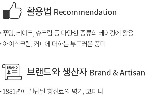 수많은 바닐라 제품 중에서도 홀 바닐라 빈에서만 얻을 수 있는 풍미는 가히 독보적이라고 할 수 있는데요. 이번에 소개할 제품은 시럽에 버번 바닐라 추출물과 바닐라 빈을 더해 만든 바닐라 페이스트예요. 바닐라 빈을 함유하여 씨가 콕콕 박혀있을 뿐만 아니라,깊고 진한 풍미를 자랑한답니다. 바닐라 본연의 부드러우면서도 달콤한 풍미를 간편하게 더하고 싶은 분에게 추천해 드릴게요. 베이킹에 활용하거나 커피,칵테일,아이스크림 등에 더해 즐겨 보세요.
