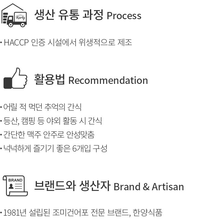 학교 앞 문구점이나 슈퍼에서 사 먹던 추억의 간식,오징어 숏다리가 새롭게 돌아왔어요. 통통한 오징어 다리만 선별하여 달짝지근한 양념을 입혀 완성했는데요. 오징어 본연의 쫄깃한 식감이 살아있어 질겅질겅 씹는 재미가 가득해요. 전자레인지에 살짝 데우면 한층 부드러운 식감으로도 즐길 수 있답니다. 넉넉한 6개입으로 구성했으니,온 가족이 즐기는 간식은 물론이고 간단한 술안주로도 활용해 보세요.