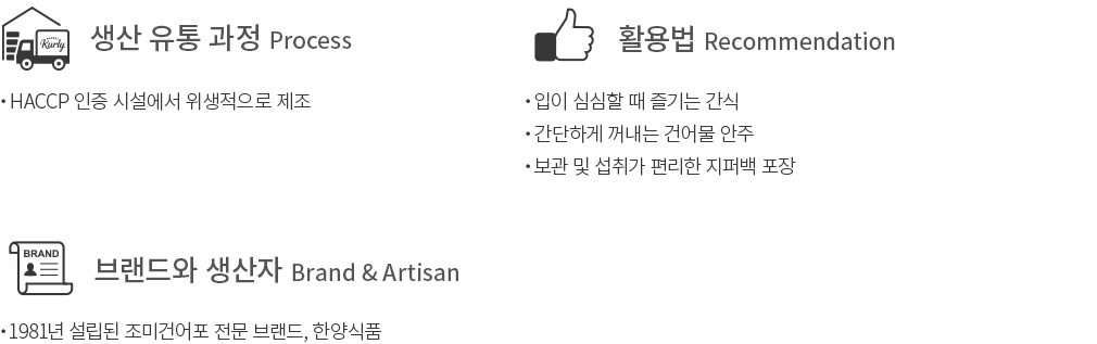 40년 전통의 조미건어포 제조 브랜드,한양식품의 꽃보다 오징어 소프트를 만나보세요. ‘소프트’라는 이름처럼 한결 부드러운 식감으로 즐길 수 있다는 장점이 있어요. 천일염,석류과즙 등으로 조미하여 씹을수록 고소하고 달짝지근한 감칠맛이 느껴지고요. 오징어 본연의 형태를 살렸기에 원하는 대로 쭉쭉 찢어 먹는 재미도 있답니다. 온 가족이 즐기는 간식 또는 간단한 술안주로 부담 없이 선택해 보세요.