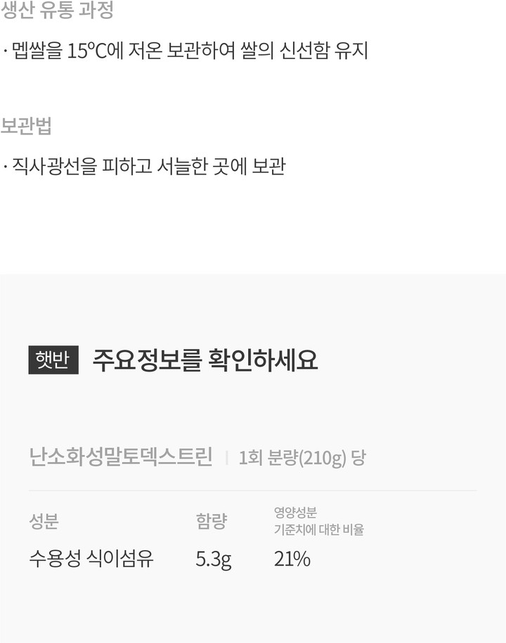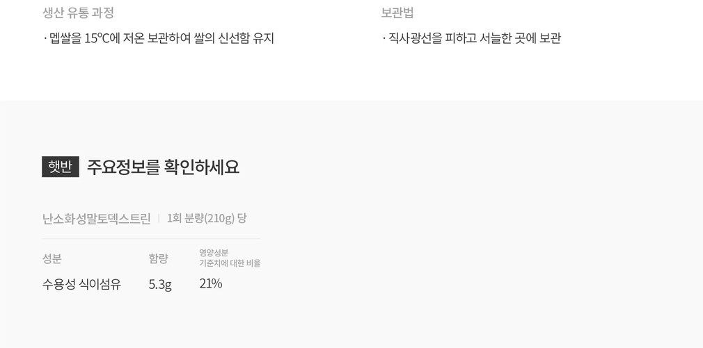 식약처가 인정한 기능성 원료를 사용한 국내 최초의 상품밥 건강기능식품,햇반 식후 혈당 조절에 도움을 줄 수 있는 밥을 소개합니다. 난소화성말토덱스트린을 함유하고 있어 같은 양의 쌀밥 제품에 비해 식후 당의 흡수를 완만하게 하여 혈당의 증가를 염려하는 사람에게 도움을 줄 수 있어요. 햇반은 국내산 멥쌀로 지어 맛있고 신선해요. 전국에서 엄선한 좋은 품질의 멥쌀을 15ºC에 저온 보관하여 쌀의 신선함을 유지했죠. 전자레인지 조리 또는 끓는 물에 가열해서 드셔보세요.
