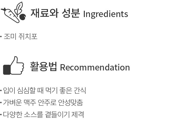 수산곳간은 중독성 강한 수산 스낵을 선보이며 컬리에서 큰 사랑을 받고 있는데요. 이번에는 짭짤한 풍미와 쫄깃한 식감을 지닌 크리스피 쥐포채 튀김을 준비했어요. 조미 쥐치포를 먹기 좋은 크기로 길게 채 썰어 바삭하게 튀긴 상품이랍니다. 깨끗한 카놀라유로 튀겨 안심할 수 있고요. 충분한 숙성 과정을 거쳤기에 쥐포 특유의 단맛과 짭조름한 감칠맛을 풍성하게 느낄 수 있어요. 이제 쥐포를 굽는 번거로움 없이,술안주 혹은 간식으로 간편하게 즐겨보세요.