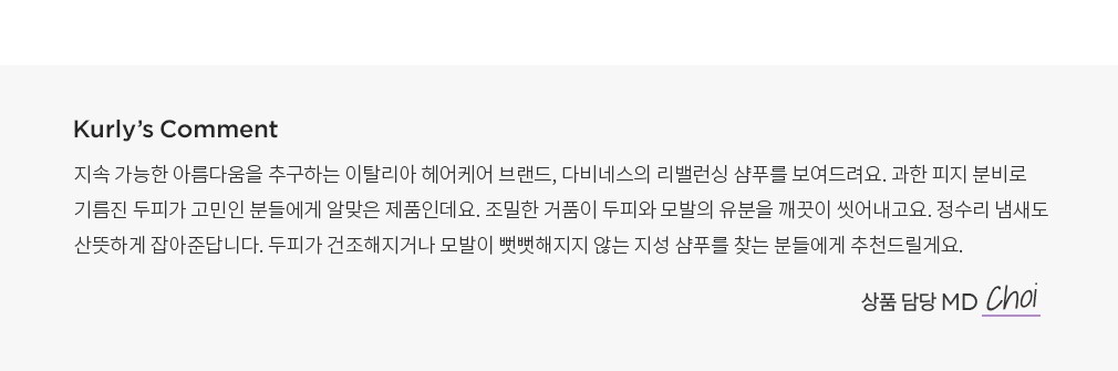 산뜻한 두피 케어,리밸런싱 라인 피지로 인해 기름진 지성 두피를 상쾌하게 케어하는 라인입니다. 두피의 유수분 밸런스를 효과적으로 조절하는데요. 흔히 지성 제품을 사용하고 나면 느껴지는,과한 두피 건조나 뻣뻣해지는 모발 없이 유분을 말끔히 제거하죠. 순한 세정 성분이 부드럽게 닿아 피지는 물론 정수리 냄새까지 산뜻하게 잡아준답니다. 개운하게 마무리하는 두피 케어,다비네스의 리밸런싱 라인으로 경험해 보세요.