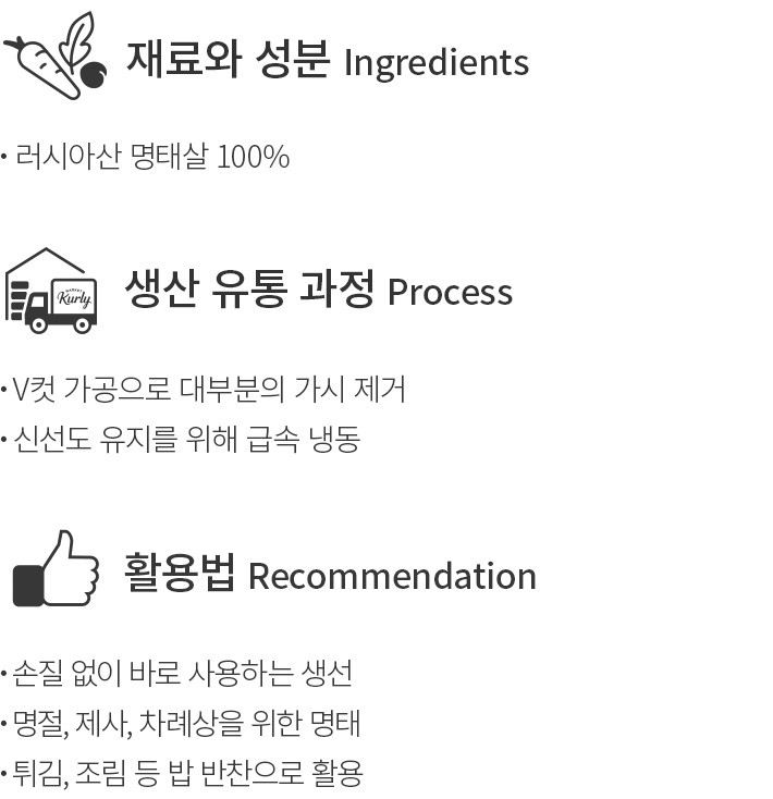 아라찬의 노하우로 정성껏 포를 뜬 동태살을 만나보세요. 누구나 손쉽게 조리할 수 있도록 명태살을 곱게 발라 슬라이스한 제품이에요. *V컷 가공으로 대부분의 가시를 제거했기에 명태의 부드러운 식감을 그대로 느낄 수 있지요. 별도로 간을 하지 않아 입맛에 맞게 조리하기도 편하답니다. 전으로 굽기에 적합한 크기와 두께이니 동태전,생선가스,튀김 등 다양하게 활용해 보세요.