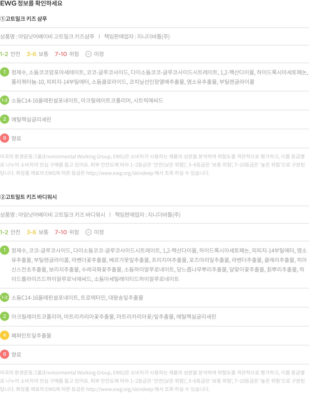 EWG에 대한 컬리의 생각 컬리는 화장품,샴푸,치약,세제 등 우리의 인체에 닿는 리빙 제품의 전성분을 공개하고 성분의 위험 정도를 EWG 기준에 따라 1~10 숫자로 안내하고 있습니다. EWG가 세계적으로 널리 사용되는 신뢰할 수 있는 척도인 것은 맞지만,상품의 안전성을 증명하는 절대적인 기준은 아니에요. EWG로부터 좋지 못한 평가를 받은 성분에 대해 전문가와 유관기관은 '권고 기준치를 지켜 사용할 경우 무해하다'고 평가하기도 합니다. 이에 컬리는 EWG 등급과 인터넷에 떠도는 단편적인 정보에만 의존하지 않고 식품의약품안전처,에코서트(ECOCERT),미국식품의약국(FDA),미국화장품원료검토위원회(CIR)등 공신력 있는 인증기관의 의견을 참고하여 유해성 여부를 꼼꼼하게 따져 보고 있습니다.