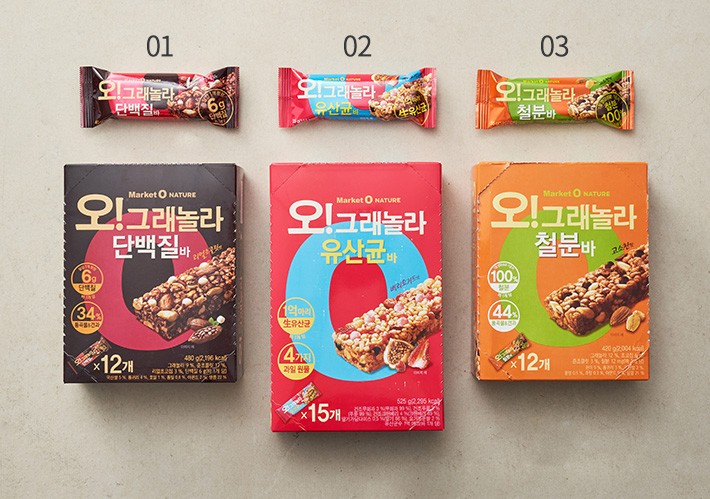 맛있고 든든하게 즐길 수 있는 마켓오네이처의 오! 그래놀라바를 만나보세요. 통곡물,견과류에 각양각색의 그래놀라를 더해 만들었답니다. 여기에 각각 단백질,유산균,철분볼을 넣어 한층 든든하죠. 출출한 순간 즐기는 간식은 물론,간단한 아침으로도 제격이랍니다. 세 가지 종류를 준비했으니 취향에 맞게 골라보세요. 개별 포장되어 있어 외출 시 하나씩 챙기기에도 좋을 거예요.