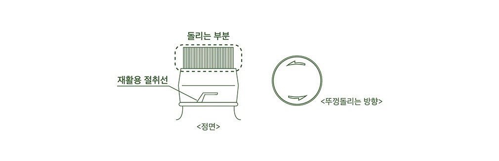 - 뚜껑의 하단 부위는 병과 뚜껑을 잇는 접합부예요. 재활용 시 절취선을 따라 뜯으면 병과 뚜껑이 간편하게 분리된답니다.