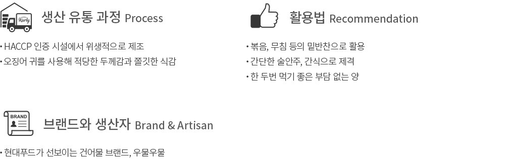 현대푸드의 건어물 브랜드,우물우물을 소개할게요. 현대푸드는 1993년부터 수산 가공품을 생산 유통해 온 내실 있는 기업인데요. 그 노하우를 담아,일상에서 쉽게 만날 수 있는 건어물을 선보이는 우물우물을 론칭했어요. 미국,페루,인도네시아 등 해외 업체와의 협력을 통해 신선한 수산물을 안정적으로 수급 받고요. 품질 관리 기술을 동반한 HACCP 인증 시설에서 위생적으로 가공해 깨끗하고 안전한 건어물을 만들고 있답니다. 우물우물이 선보이는 다채로운 건어물의 세계,컬리에서 만나보세요.