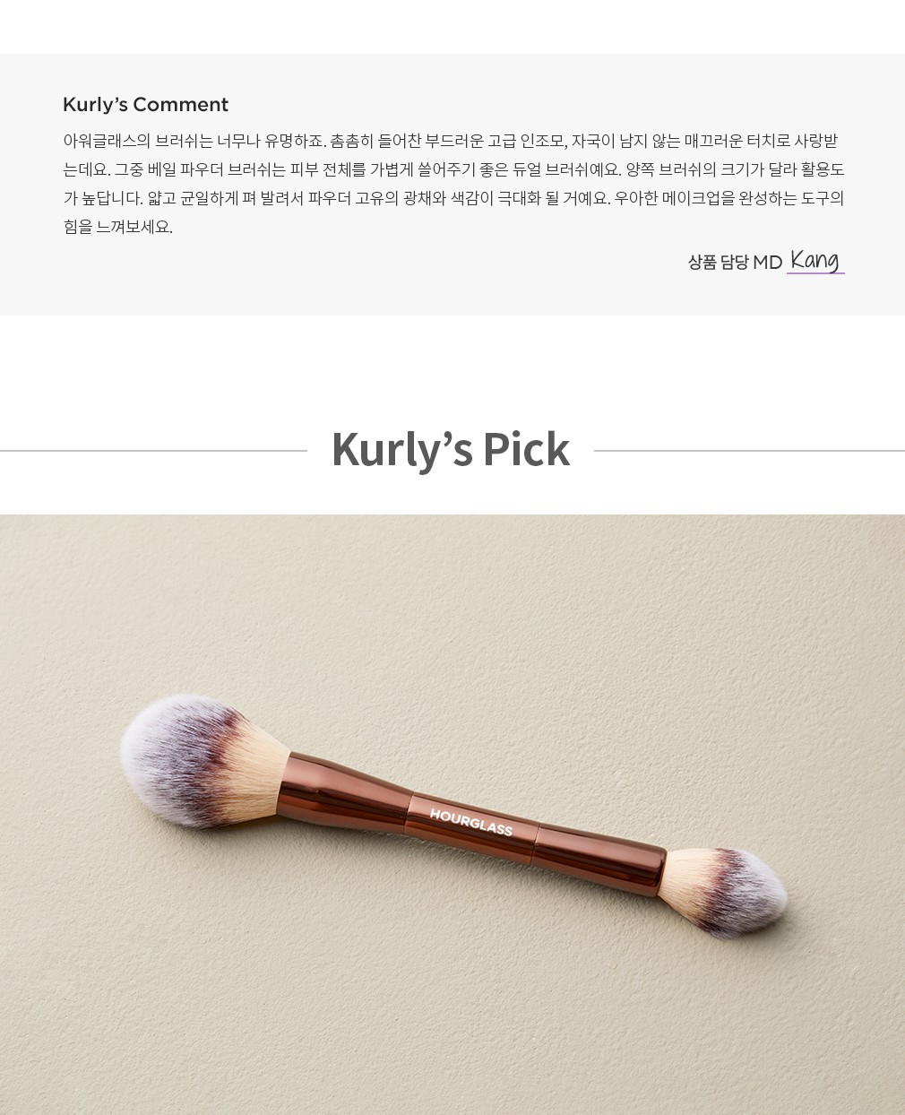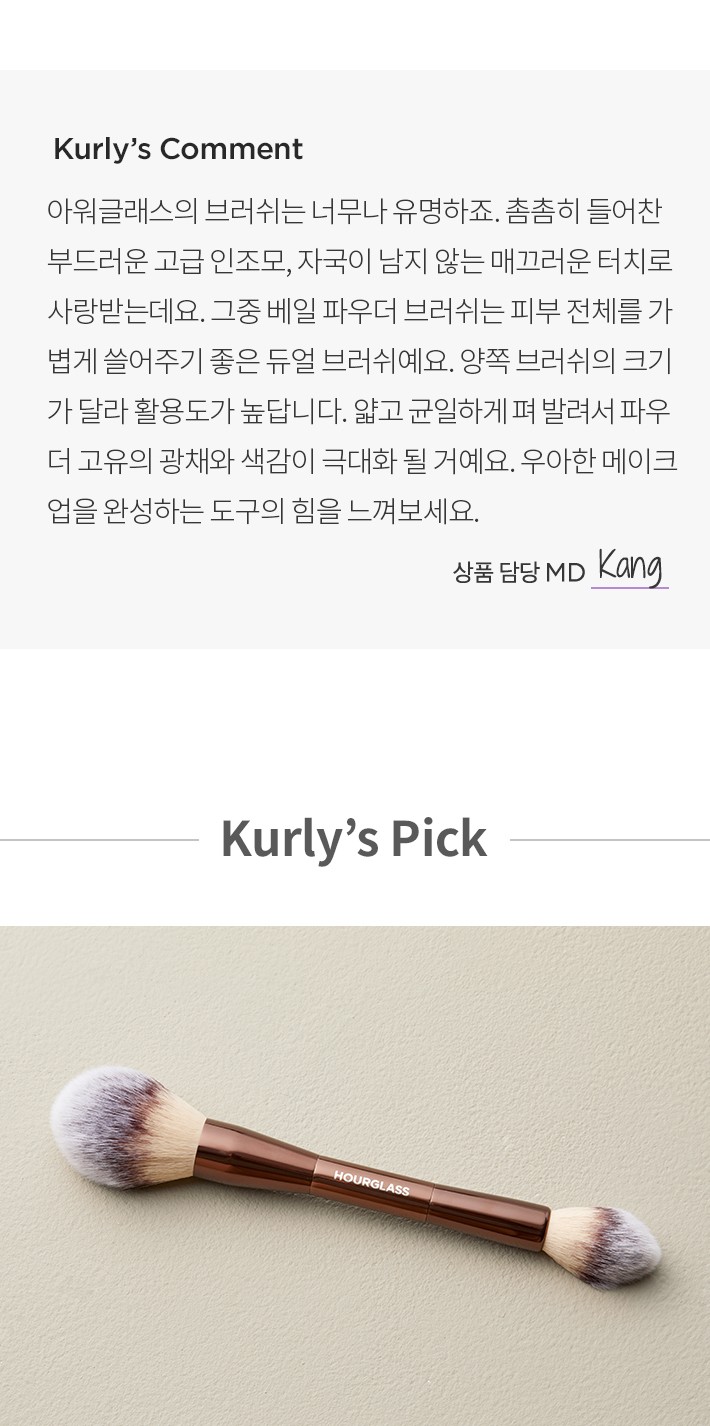 활용팁・넓은 브러쉬:피니쉬 파우더를 얼굴 전체에 가볍게 쓸어주기 좋아요. 아워글래스의 베일 트랜스루센트 세팅 파우더와 함께 사용해 보세요.
