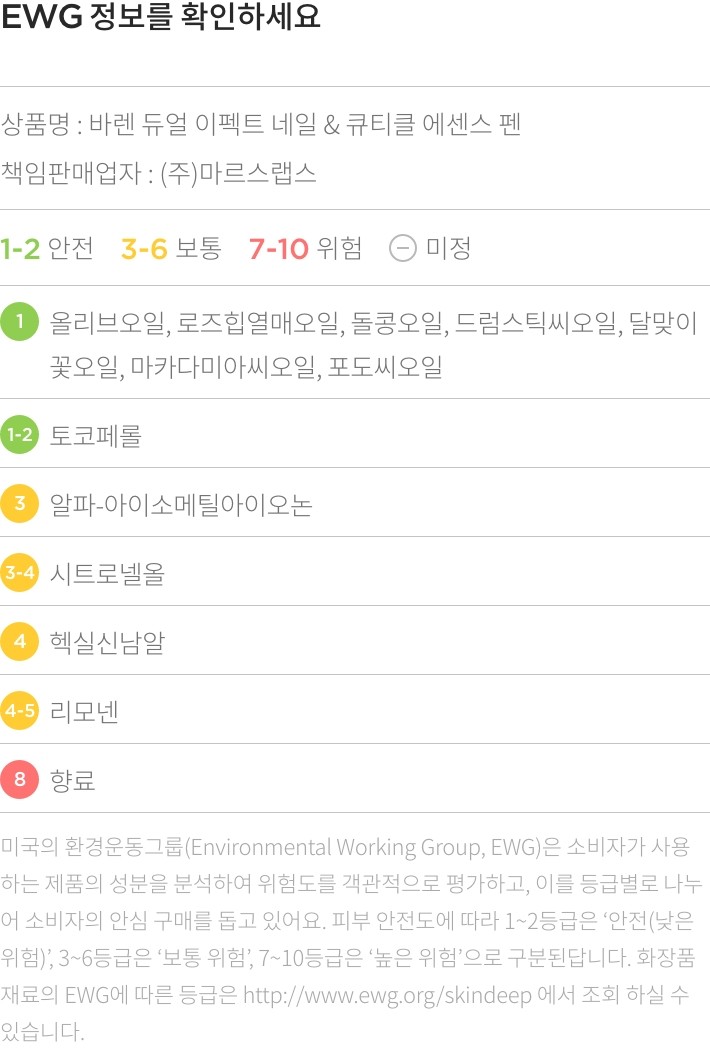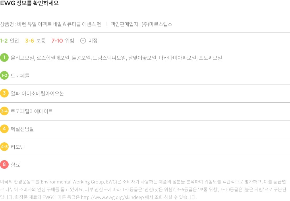 ・ 특징:자연 유래 성분을 담은 펜 타입의 오일 에센스입니다. 깊은 보습감을 전해 손톱을 건강하게 가꿔줘요.