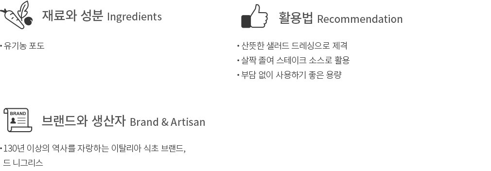 1889년에 설립된 드 니그리스는 이탈리아의 식초 전문 브랜드예요. 이탈리아의 뜨거운 햇볕을 받고 자란 신선한 과일들을 특별히 제작한 오크 통에서 숙성하여 뛰어난 품질의 식초를 만듭니다. 유기농 식초를 비롯하여 과일,와인,발사믹 식초 등 소비자 트렌드에 발맞춰 다양한 식초를 연구하고 개발하지요. 이제는 이탈리아를 넘어 전 세계에서 사랑받는 글로벌 브랜드로 거듭나게 되었답니다.