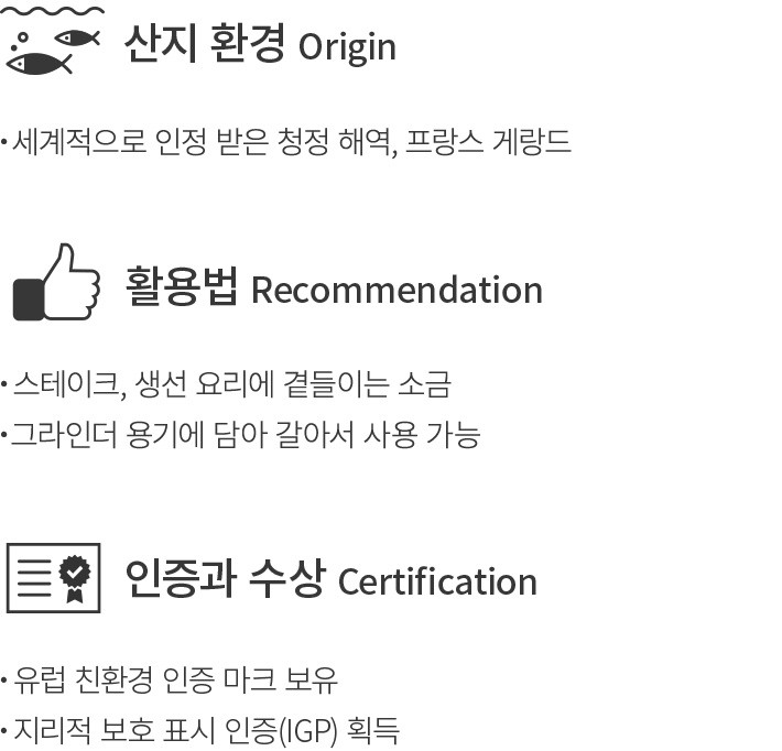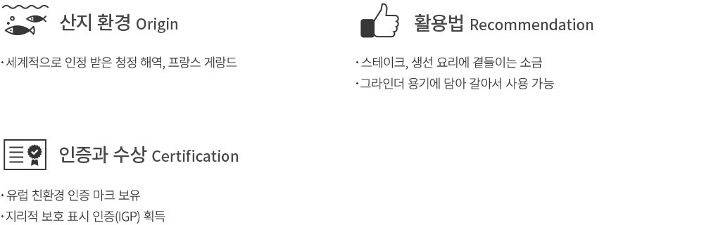 프랑스 게랑드 지방의 풍부한 햇살과 바람이 만들어 낸 소금,르 게랑드의 토판 천일염을 소개합니다. 토판염은 바닷물을 갯벌에 가둬 햇빛에 증발시키는 가장 자연적인 방식으로 만드는 소금이에요. 100% 천연 제품에만 부여되는 유럽 친환경 인증을 획득했을 만큼 깨끗한 청정 해역에서 생산되고 있죠. 이렇게 생산된 토판염은 쓴 맛 없이 짭짤하면서도 특유의 달콤한 감칠맛을 지녔답니다. 소금의 풍미를 오롯이 더할 수 있도록 입자가 굵은 소금으로 넉넉히 보내 드릴게요. 기존에 있던 그라인더를 채우는 리필용 소금으로도 제격일 거예요.