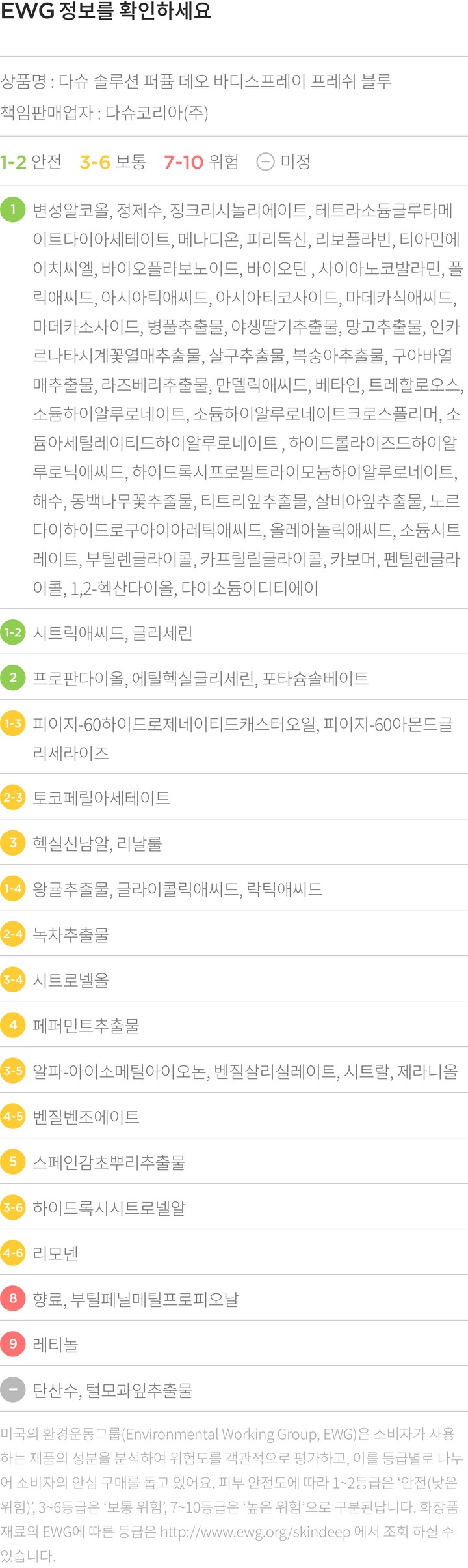 사용법・ 샤워 후 또는 외출 전,얼굴을 제외한 바디에 가볍게 분사하세요.
