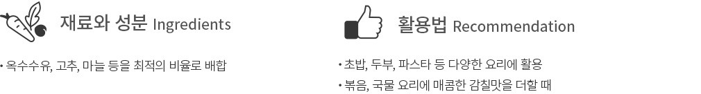 은은한 매콤함으로 입맛을 사로잡는 에스앤비의 오카즈라유를 소개합니다. ‘라유’는 중국어로 고추기름을 뜻하는데요. 지금 만나볼 오카즈라유는 옥수수유에 고추를 볶아 고추기름을 낸 다음,튀긴 마늘,양파 분말,아몬드 등을 알맞게 더해 독특한 감칠맛을 자랑해요. 다양한 재료가 조화롭게 어우러져 풍성한 식감 또한 자아내지요. 초밥이나 두부 등에 올려 드셔도 좋고요. 볶음,국물 요리에 활용하기에도 제격일 거예요.