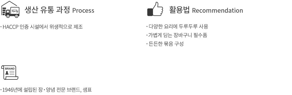샘표 간장은 70여 년간 변치 않고 대한민국 주부들의 사랑을 듬뿍 받는 간장이에요. 지금 만나 볼 한식 국간장은 샘표만의 발효기술로 깔끔하고 깊은 맛을 담아낸 제품이랍니다. 국산 다시마로 자연스러운 감칠맛을 살려 완성했기에 다양한 한식 요리의 풍미를 끌어올려 주기 제격이죠. 맑은 빛깔을 지녀 국물,무침 요리에 활용하기에도 참 좋고요. 나물이나 전골 등 정갈한 한식 요리에 사용하기에도 좋으니 장바구니에 쏙 담아보세요.