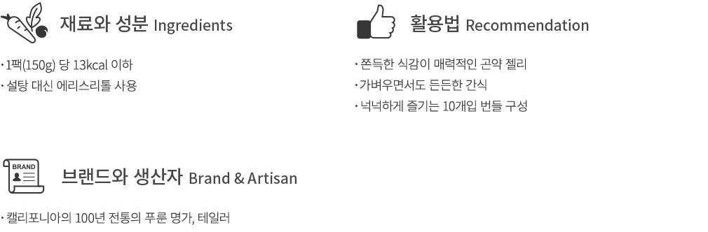 100년의 전통을 가진 캘리포니아 브랜드,테일러의 애프터 딥워터 코코젤리밥을 소개합니다. 코코넛 워터로 만든 젤리인 나타드코코를 듬뿍 넣어 쫀득한 식감을 더한 곤약 젤리예요. 설탕 대신 에리스리톨로 단맛을 더하고 한층 더 가볍게 완성했지요. 상큼하면서도 달달한 복숭아,사과,샤인머스캣 맛을 준비했으니 출출하거나 입이 심심할 때 하나씩 드셔 보세요. 냉장고에 넣어두고 차갑게 먹으면 더위를 식혀주는 디저트로도 제격이랍니다.