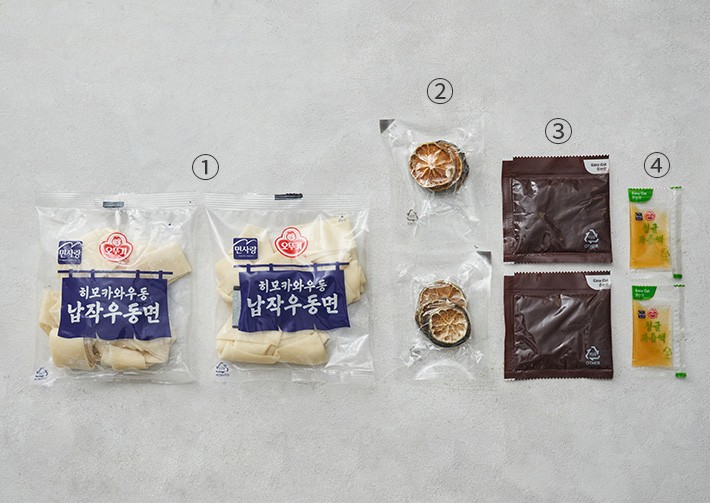 히모카와 우동・구성:①납작우동면(150g X 2봉),②청귤칩(3g X 2봉),③우동장국(40g X 2봉),④청귤과즙액(5g X 2봉)
