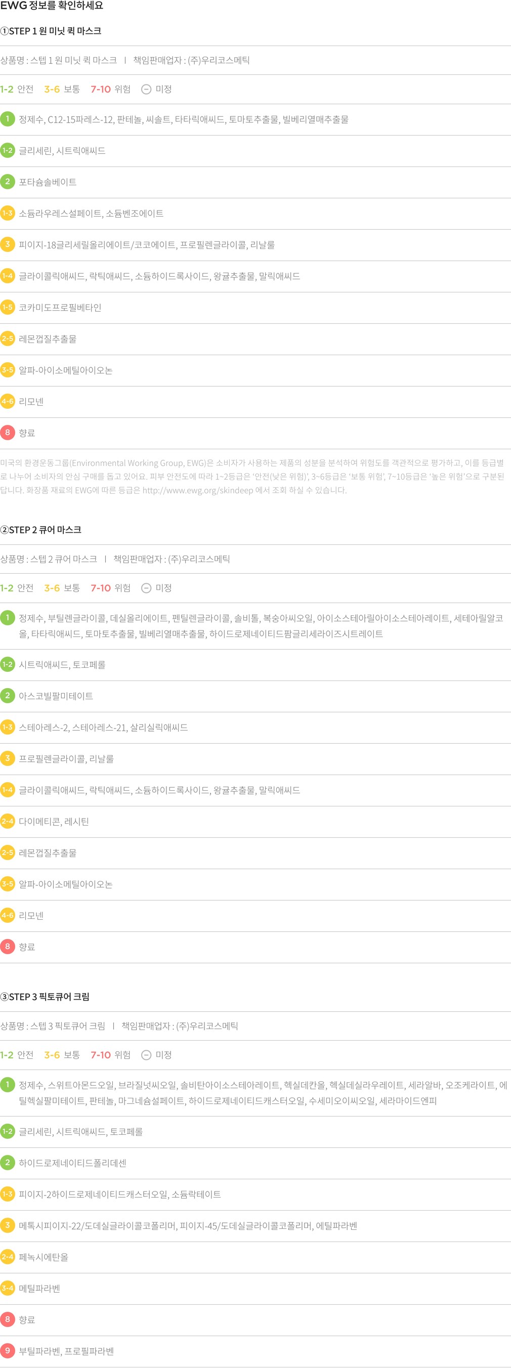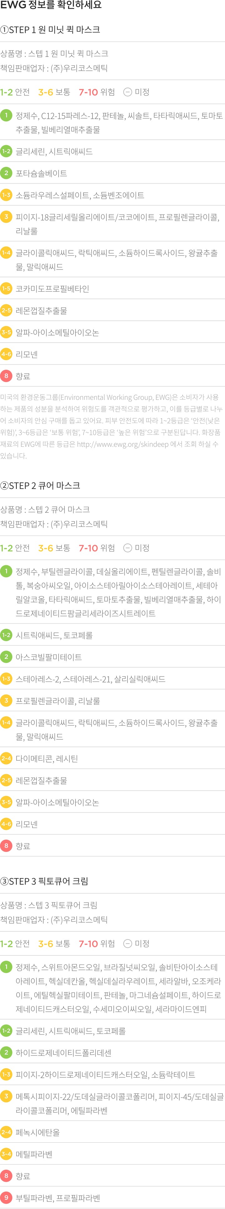 유의사항・ STEP 1 퀵 마스크와 STEP 2 큐어 마스크의 경우,피부에 따라 일시적으로 자극이 느껴질 수 있어요. 정상적인 반응이니 안심하고 사용하세요.