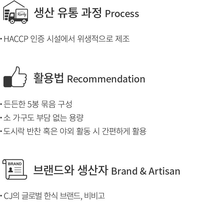 불에서 달달 볶아 새콤달콤하게 즐기는 김치 볶음은 상상만으로 군침을 돌게 해요. 비비고의 김치 볶음은 착한 재료와 특별 레시피로 풍미와 식감을 한층 끌어냈어요. 국내산 배추와 고춧가루,천일염을 사용해 안심이고요. 직화 볶음 솥에서 볶아내 김치의 아삭한 식감을 그대로 살려냈죠. 볶는 과정에서 마늘을 넣은 볶음풍미유를 사용하는데요. 입맛을 자극하는 달큼한 감칠맛의 이유랍니다. 한 번에 먹기 좋은 용량을 담아 5봉 묶음 구성으로 보내드리니,야외에도 간편히 휴대해 즐겨 보세요.