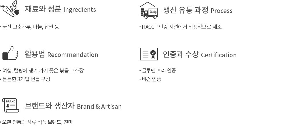 고추장을 한층 더 편안하게 드실 수 있도록 만든 진미식품의 글루텐 프리 &비건 볶음고추장을 만나 보세요. 국산 고춧가루와 찹쌀,마늘 등 꼼꼼히 엄선한 재료로 만든 고추장인데요. 매콤한 감칠맛과 은은한 단맛이 어우러져,따뜻한 밥을 슥슥 비벼 먹기만 해도 다른 반찬이 필요 없답니다. 글루텐 프리일 뿐만 아니라,비건 인증까지 받아 더욱 믿음이 가는 것은 물론이고요. 적당한 양만큼 담아 개별 포장하였으니 여행이나 캠핑에 챙겨 가기도 참 좋을 거예요.
