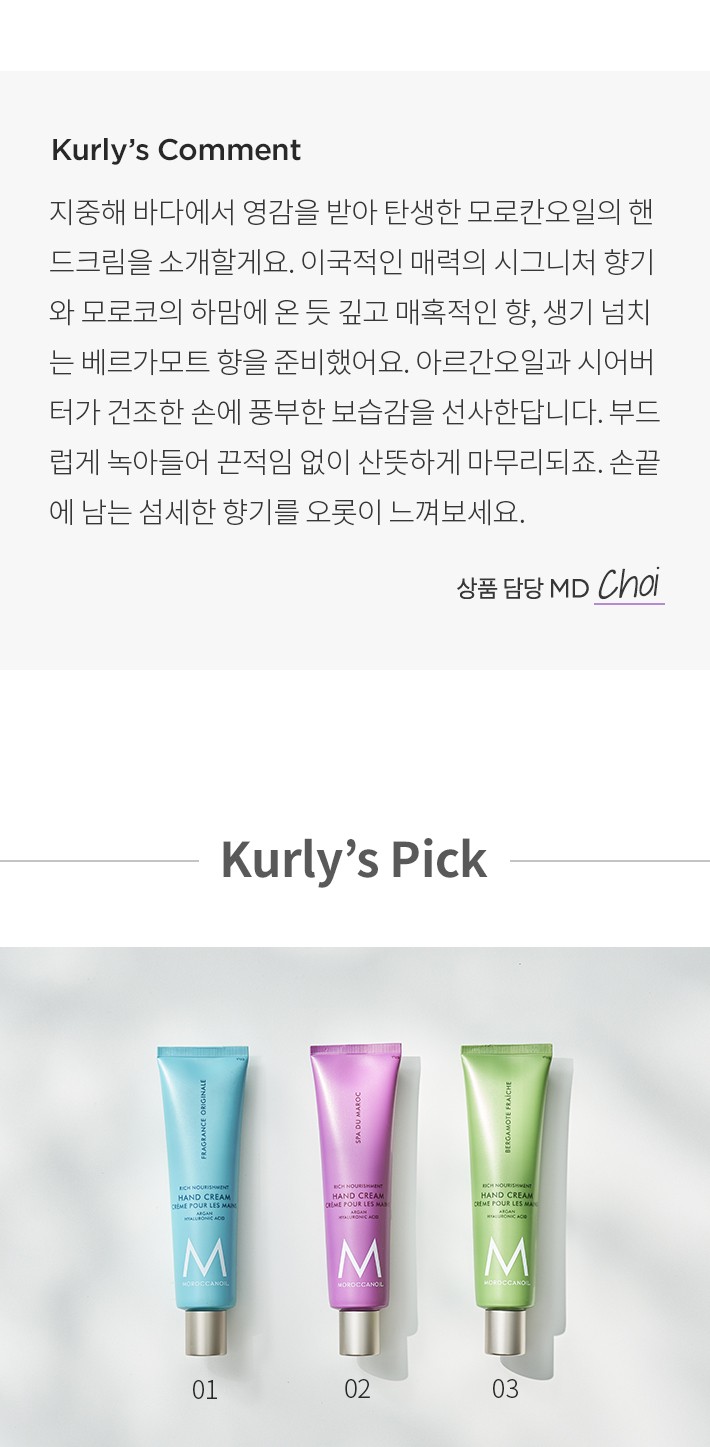 ・ 특징:모로칸오일의 시그니처 향을 담았어요. 스파이시 앰버와 플로럴이 어우러져 살짝 묵직하면서 고급스러운 느낌이 들어요.