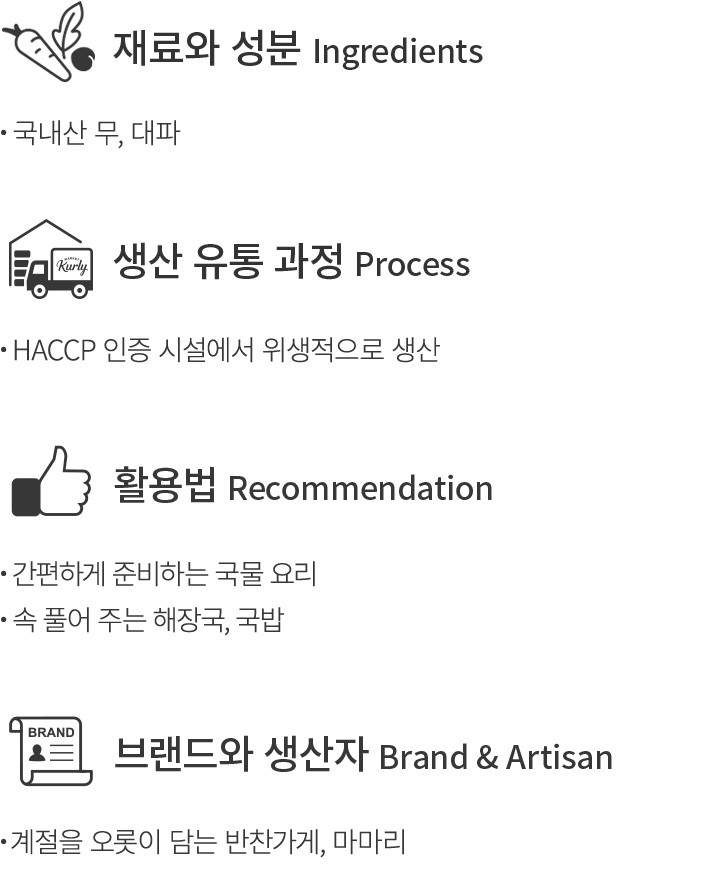 기운이 없고 마음이 헛헛한 날엔,마마리의 황태 곰탕으로 속을 훈훈하게 덥혀 보세요. 곰탕이라는 이름에 걸맞게 뽀얀 국물을 자랑하는데요. 황태채를 오랜 시간 정성껏 우려내 살은 부드럽게 풀어지고 국물은 진득하니 밀도 있게 변했어요. 여기에 무와 대파로 개운함까지 더해 주었지요. 냄비에 팔팔 끓여 주기만 하면 되니 냉동실에 든든하게 구비해 두고 간편하게 활용해 보세요. 매일의 식사를 책임지는 국 요리부터 아린 속을 풀어 줄 해장국까지 다양하게 즐길 수 있답니다.