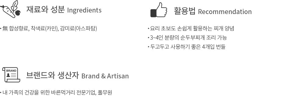 풀무원의 짬뽕 순두부찌개 양념으로 간편하게 오늘의 한 끼를 완성해 보세요. 이런저런 양념이나 육수 없이도,소스 1봉만으로 깊은 국물 맛을 낼 수 있는 순두부찌개 양념이에요. 갖은 재료를 넣어 만든 양념장을 한 번 볶아냈기에 더욱 감칠맛이 살아 있지요. 채소나 두부만 준비하면 정성 가득 얼큰한 순두부찌개도 손쉽게 만들 수 있답니다. 3~4인 분량의 찌개 양념 4개를 보내 드리니,넉넉히 사용하기에도 참 좋을 거예요.