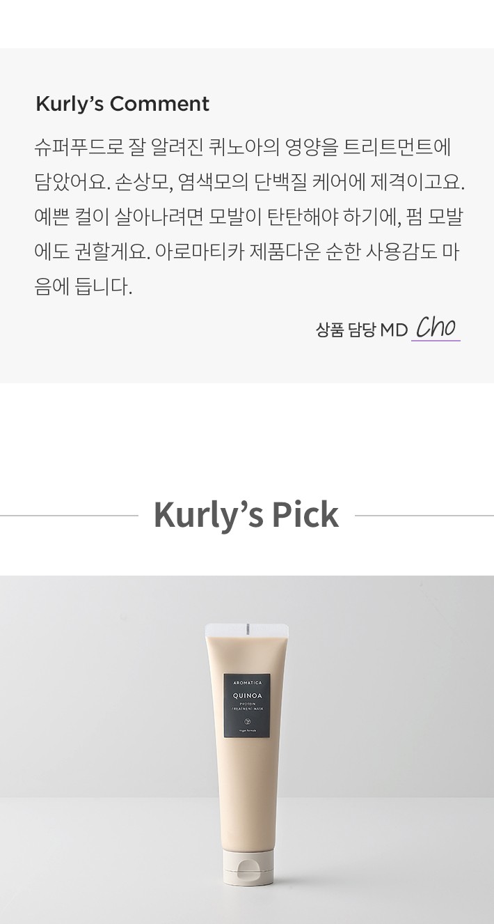 추천 루틴・ 아로마티카의 다른 퀴노아 프로틴 라인 제품들과 함께 사용해 보세요. 손상모를 위한 고단백,고영양 케어 루틴이 완성됩니다.
