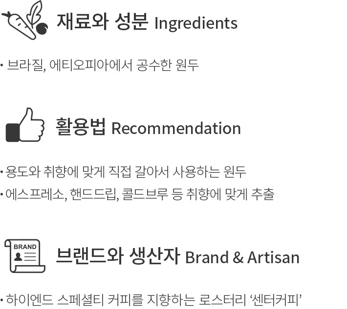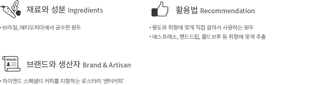 ・특징 :에티오피아 특유의 기분 좋은 산미와 은은한 단맛이 완벽한 조화를 선사해요.