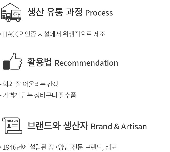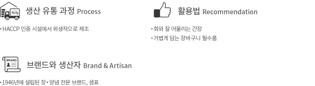 신선한 회를 제대로 즐기려면 회와 잘 어울리는 간장을 선택하는 게 중요한데요. 간장 하나도 까다롭게 선택하는 분들을 위해 샘표의 회간장을 준비했습니다. 가쓰오 국물과 국산 다시마 농축액을 더해 진한 감칠맛을 살려낸 간장이에요. 회의 맛을 더욱 섬세하게 느낄 수 있도록 염도를 낮춰 완성했고요. 특별히 제작한 안심 밀폐 용기는 간장의 향미를 끝까지 지킬 수 있도록 해준답니다. 평소에 회를 즐겨 드시거나 감칠맛이 풍부한 간장을 찾으시는 분에게 추천해 드릴게요.
