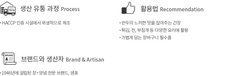 만두를 더 맛있게 만들어주는 간장소스를 소개합니다. 간장에 발효식초와 생강 농축액 등을 배합해 깔끔하면서도 은은한 감칠맛을 살려낸 소스예요. 특별히 제작한 안심 밀폐 용기는 간장의 향미를 끝까지 지킬 수 있도록 해준답니다. 적당히 짭조름해서 아이들도 편하게 먹기 좋을 거예요. 바삭한 군만두부터 부드러운 물만두,찐만두까지,모든 만두에 곁들여 즐겨 보세요. 취향에 따라 고춧가루를 더해 매콤하게 드시거나 튀김,모둠전,부침개 등 다양한 요리에 곁들여도 좋아요.