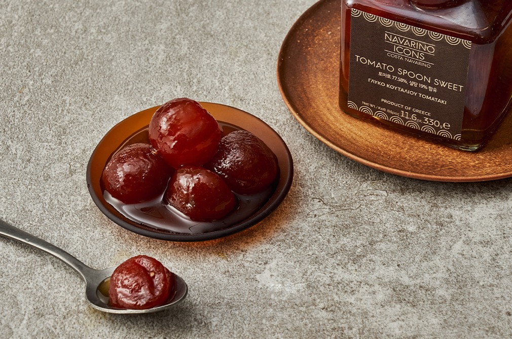 스푼 스위츠는 과일이나 견과류를 당절임 형태로 만든 그리스 전통 디저트인데요. 지금 소개할 나바리노 아이콘즈의 토마토 스푼 스위츠는 체리토마토를 레몬주스,설탕으로 만든 시럽에 절여 만들었어요. 샐러드 토핑이나 샴페인에 곁들이는 아주로도 좋을 거예요.