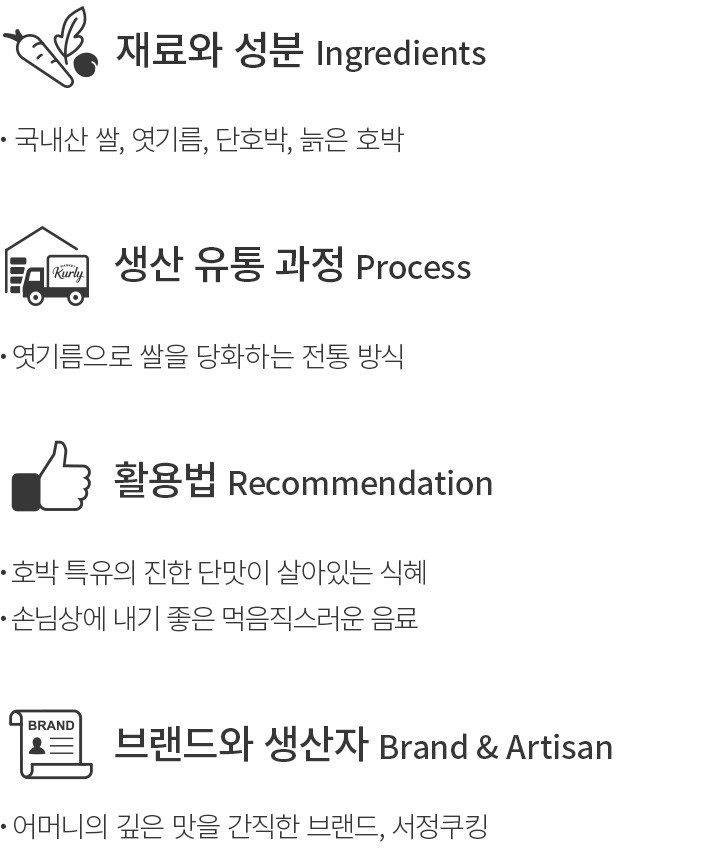 30년간 한식을 연구해 온 서정옥 대표의 비법을 고스란히 담은 서정쿠킹의 느린 호박 식혜를 만나 보세요. 전통 방식 그대로 만들어 풍미가 잘 살아 있답니다. 가마솥으로 지은 밥에 엿기름 물을 푼 뒤,5시간 이상 따뜻한 상태로 두어 엿기름과 밥알이 함께 삭도록 했어요. 국내산 단호박과 늙은 호박으로 자연스러운 단맛을 더했고요. 쌀알의 식감이 살아 있어 그냥 마셔도 맛있지만,살짝 얼려 디저트로 활용해도 좋아요. 식사의 여운을 감미롭게 마무리 지어 주는 역할로 제격이랍니다.
