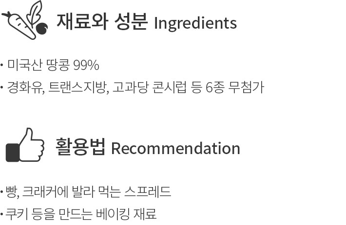 ・특징:땅콩 입자를 큼직하게 갈아 넣어,오독오독 씹히는 식감이 재미난 잼이에요.