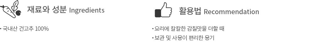 고춧가루는 한식 요리를 할 때 없어선 안 될 핵심 재료 중 하나인데요. 지금 소개하는 하늘찬의 국산 청양 고춧가루는 신선한 국산 건고추를 곱게 갈아 만든 제품이에요. 청양고추 본연의 얼얼한 매콤함을 오롯이 담아냈기에,소량만 더해도 매콤한 감칠맛을 즐길 수 있지요. 사용이 간편한 용기에 담겨있는 것은 물론,부담 없는 소용량이니 고민 없이 선택해 보세요.
