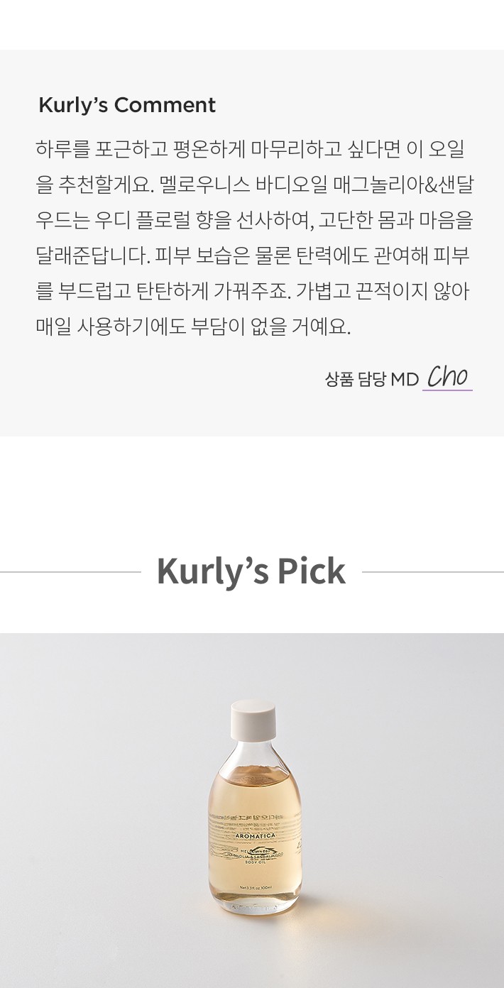 ・ 특징:새하얗게 핀 목련과 파우더리한 발사믹 향취의 통카빈이 조화를 이루는 바디오일이에요. 묵직한 샌달우드로 마무리 되어 풍성한 잔향을 선사합니다.